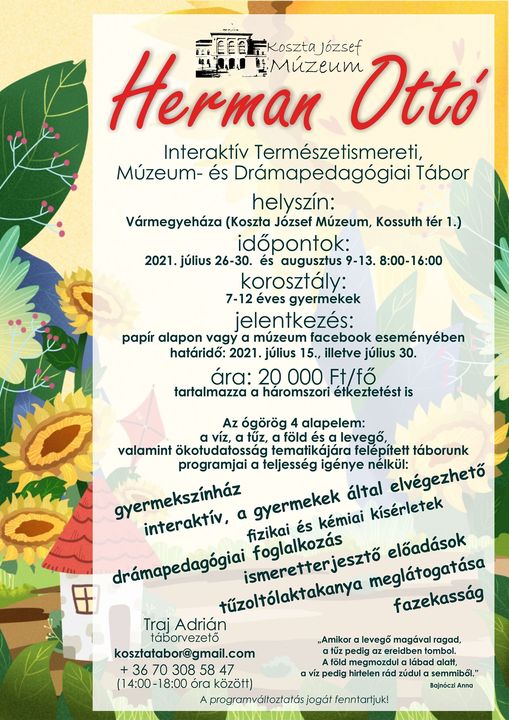 A Koszta József Múzeum idén is megrendezi a Herman Ottó Interaktív Természetismereti, Múzeum- és Drámapedagógiai Tábor 7-12 éves kor közötti gyerekeknek. Az ógörög 4 alapelem: a víz, a tűz, a föld és a levegő, valamint ökotudatosság tematikájára felépülő táborunkban olyan kérdésekre keressük a választ többek között, mint:
