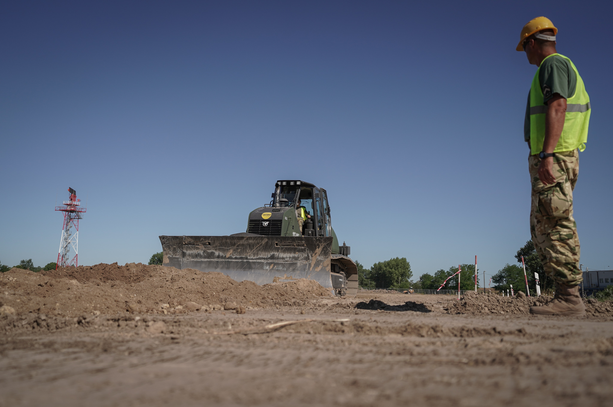 A műszaki ezred katonái feszített munkatempóval dolgoznak az MH 59. Szentgyörgyi Dezső Repülőbázis területén az augusztus végén megrendezésre kerülő Nemzetközi Repülőnap és Haditechnikai Bemutató előkészítő munkálataiban. Alakulatunk tizenöt technikai eszközzel és tizennyolc fővel, mintegy másfél hónapon keresztül közel 25.000m3 föld megmozgatásával járó összetett műszaki feladatot hajt végre a kecskeméti repülőbázison. Az előkészítő munkálatok során honvédeink által kialakításra kerül a dinamikus harckocsi bemutató pályájának nyomvonala, a statikus bemutatók, valamint gépjármű parkoló területe.