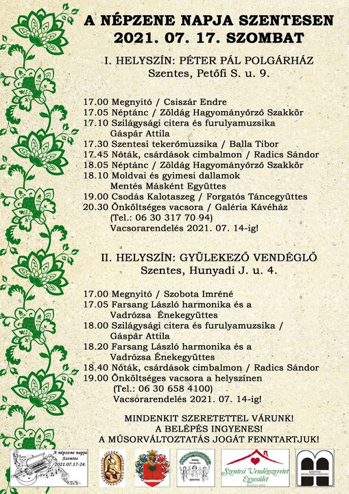☀️☀️☀️KULTURÁLIS PROGRAMOK☀️☀️☀️ A népi zene hagyománya fontos szerepet tölt be Szentesen. Erre mutat tanúbizonyságot, hogy ismét megrendezik a Népzene Napját július 17-én.