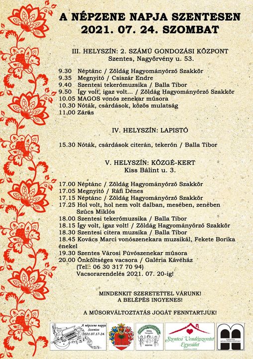 KULTURÁLIS PROGRAMOK 2021. július 24-én szombaton a Népzene Napja alkalmából töb…
