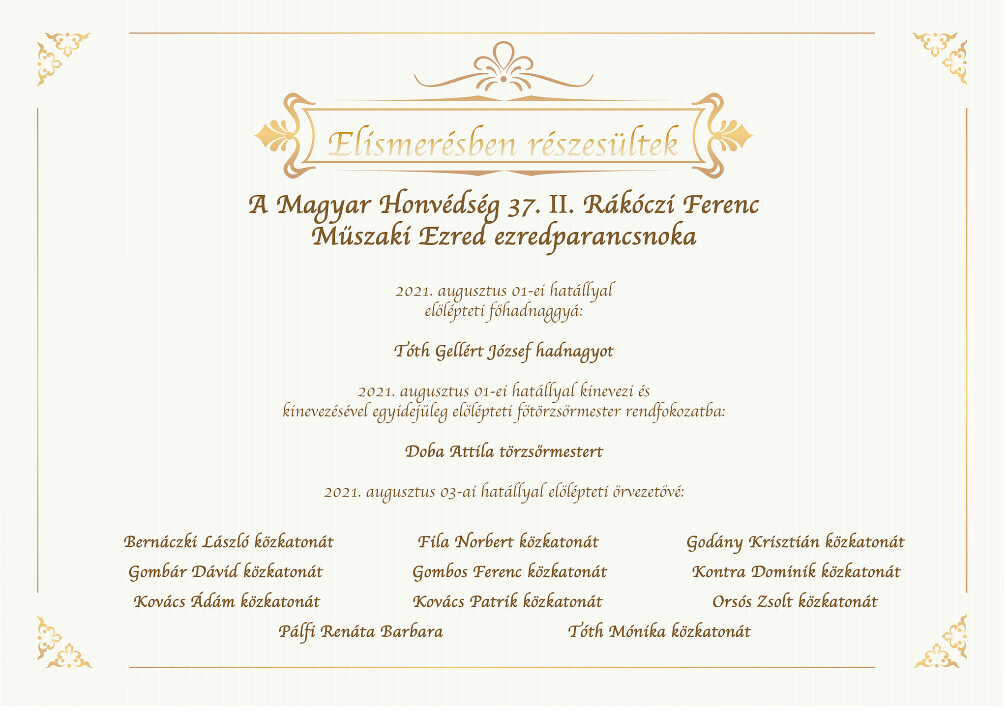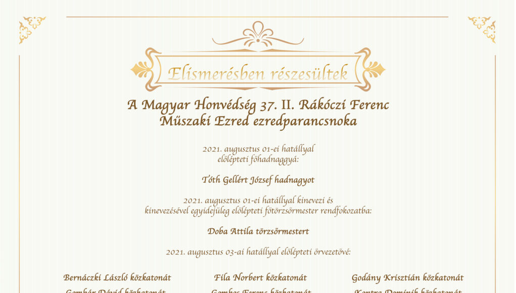 Kezdőlap MH 37. II. Rákóczi Ferenc Műszaki Ezred A heti vezetői értekezlet keretén belül előléptetésekre és kinevezésre került so…