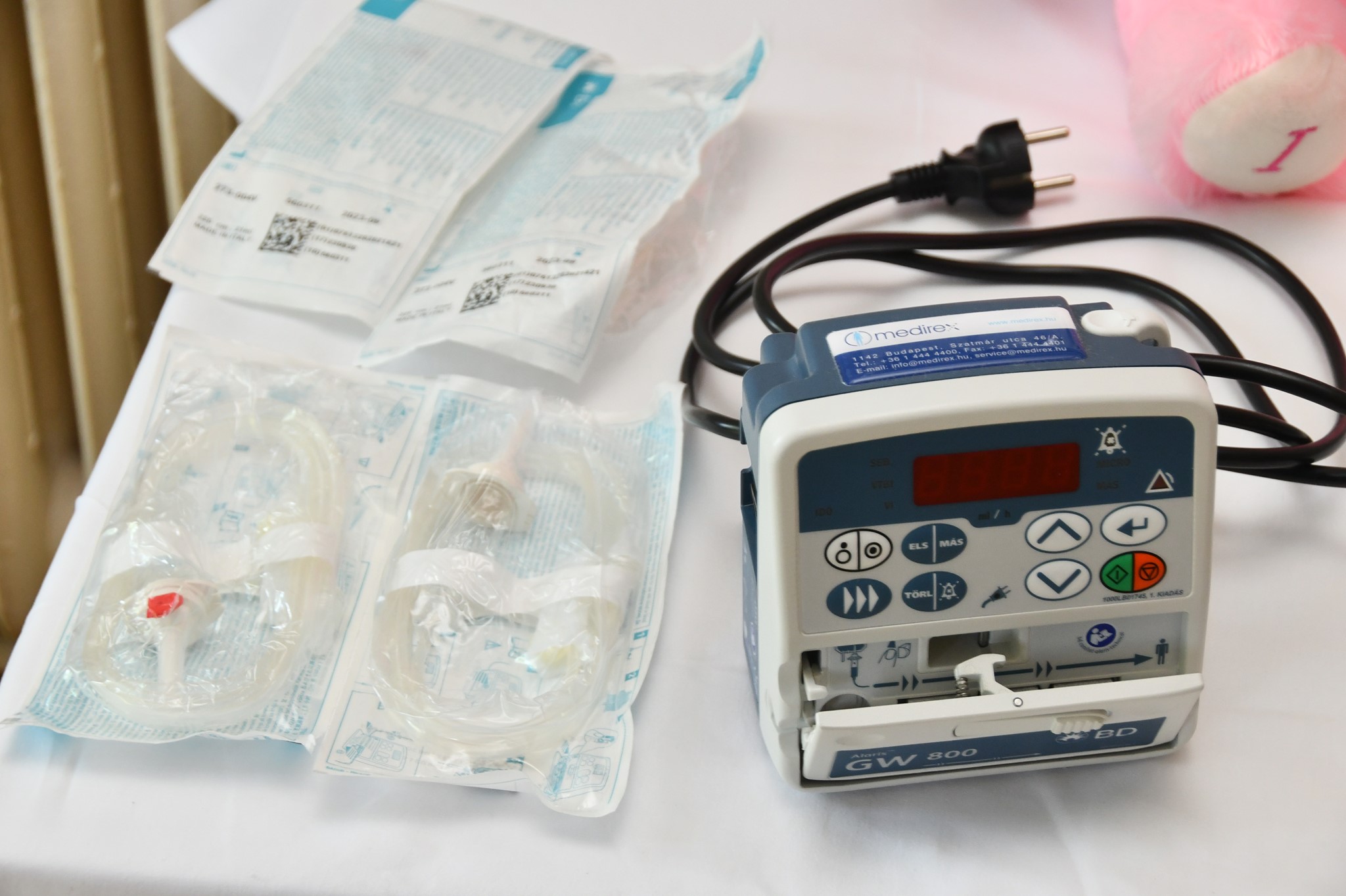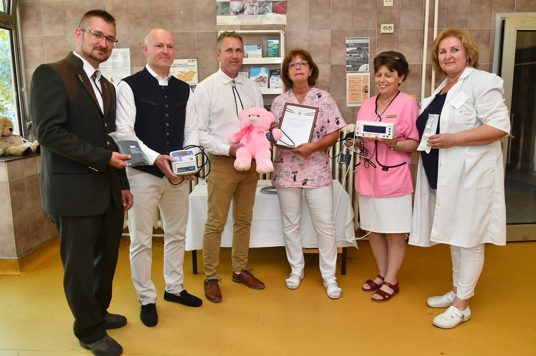 A kórház részéről Dr. Abebené Bagi Márta ápolási igazgatónő és Hetyei Erika főorvos vette át az ajándékot, majd az érdeklődőknek megmutatták az osztályon „dolgozó” plüss mackón, hogy miért különleges pl. a vérnyomásmérő és annak mandzsettája.