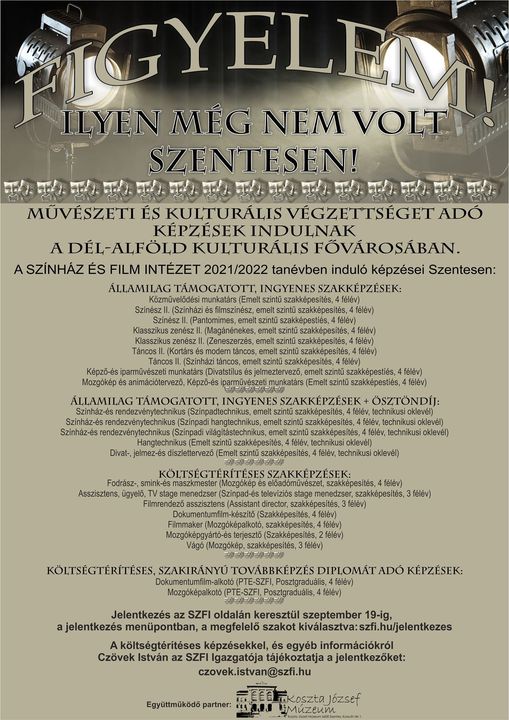 Szentesen új képzések indulnak ősszel a Színház és Film Intézet szervezésében, államilag támogatott és önköltséges közép- és felsőfokú tanfolyamokkal. A jelentkezési határidő: 2021. szeptember 19. További részletek a plakáton!