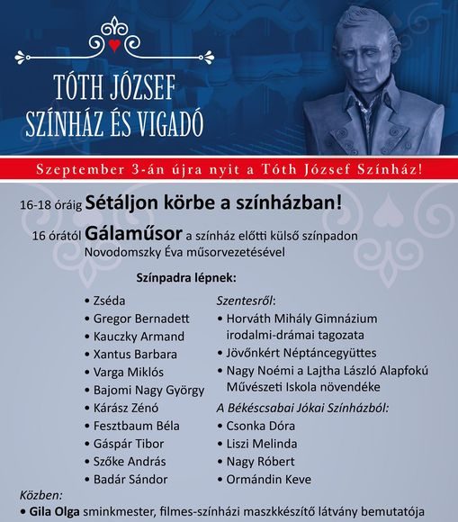 16 órától Gálaműsor a színház előtti külső színpadon Novodomszky Éva műsorvezetésével