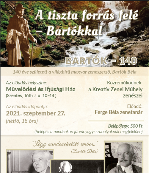 🍁🍁ÉLJEN A SZEPTEMBER🍁🍁 140 évvel született Bartók Béla világhírű magyar zeneszerző. Munkásságáról Ferge Béla zenetanár tart előadás szeptember 27-én (hétfőn) 18 órakor a Művelődési és Ifjúsági Házban. 🍁🍁Várjuk Önöket szeretettel. A jelenleg hatályos jogszabályok értelmében védettségi igazolvány NÉLKÜL!🍁🍁