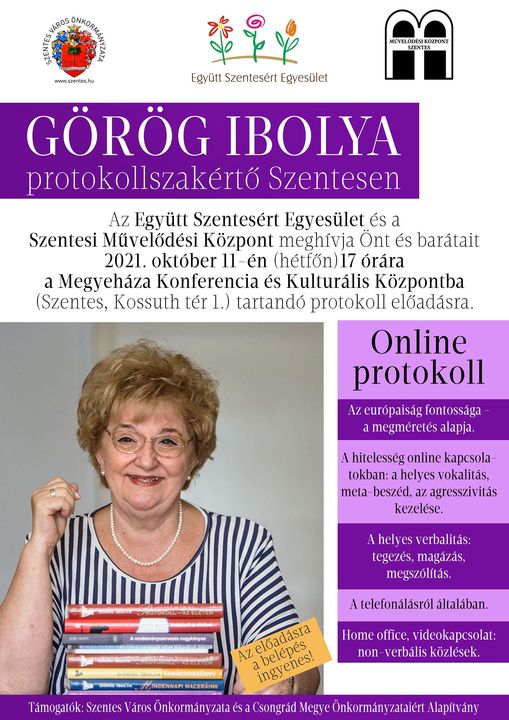 Az Együtt Szentesért Egyesület és a Szentesi Művelődési Központ meghívja Önöket 2021. október 11-én, hétfőn 17 órára a Megyeháza Konferencia és Kulturális Központba Görög Ibolya Online protokoll című előadására. A belépés ingyenes. Részletek a plakáton.