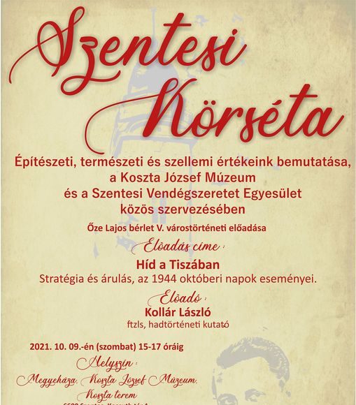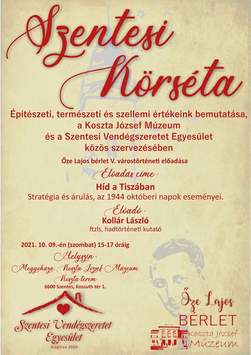 Híd a Tiszában – Stratégia és árulás, az 1944 októberi napok eseményei címmel Kollár László ftzls, hadtörténeti kutató tart előadást október 9-én, szombaton, 15 és 17 óra között a Koszta József Múzeum, Koszta termében. A program az Őze Lajos bérlet V. várostörténeti előadása, melyet a múzeum és a Szentesi Vendégszeretet Egyesület együttműködésében a Szentesi Körséta keretein belül rendezik meg. Szeretettel várják az érdeklődőket!