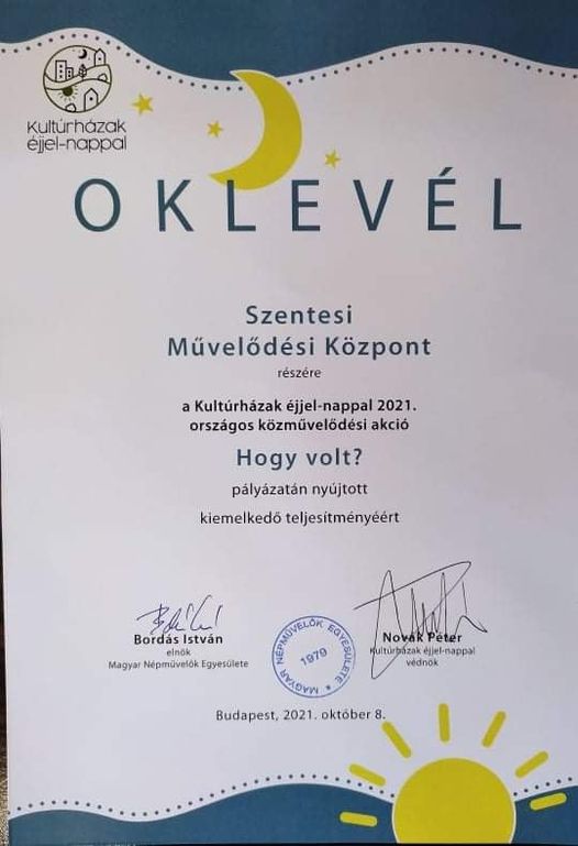 A Magyar Népművelők Egyesülete 2021. szeptember 24–26-i hétvégén rendezte meg a 15. Kultúrházak éjjel-nappal programsorozatot, amikor ismét több száz kulturális központ, művelődési ház, közösségi színtér várta az érdeklődőket országszerte és határon túl is változatos és értékes programokkal. Az eseménysorozat célja az, hogy minél többen legyenek részesei a közművelődési intézmények által nyújtott kulturális sokszínűségnek, értékelvűségnek.