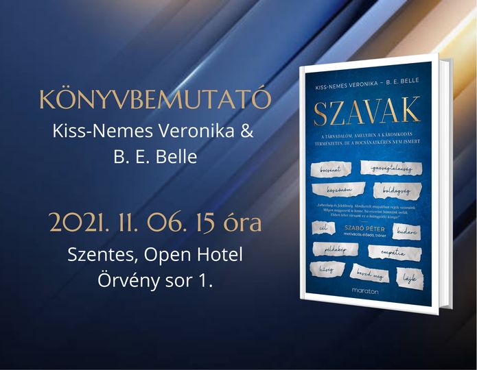 A Szavak, amely egy pszichológiai könyv, továbbá önismereti és önfejlesztő napló is egyben, november 8-án lát hivatalosan is napvilágot. Ez alkalomból NOVEMBER 6-ÁN (SZOMBATON) 15 órától a szerzők személyesen mutatják be könyvüket SZENTESEN az OPEN HOTEL kávézójában és éttermében. 15 órától vezetett beszélgetés zajlik a könyvről 20-25 percben, majd közönségkérdések is lehetőséget kapnak, végül pedig dedikálással zárul az esemény. A bemutató alkalmával lehetőség nyílik a mű két szerzőnőjével egyszerre találkozni, beszélgetni és dedikáltatni.
