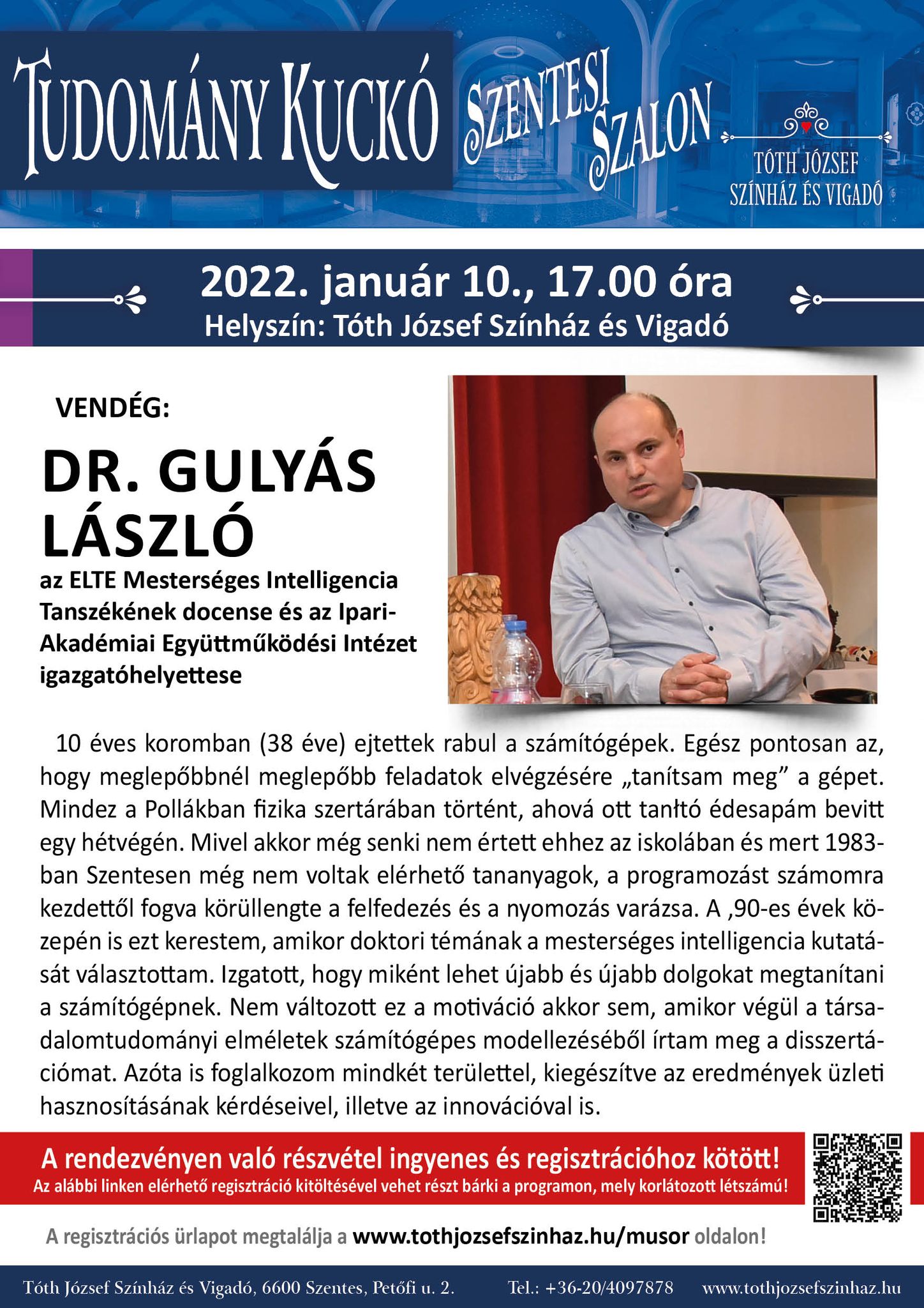 Január 10., hétfő 17.00 Szentesi Szalon – Tudomány kuckó; Vendég: Dr. Gulyás László az ELTE Mesterséges Intelligencia Tanszékének docense és az Ipari-Akadémiai Együttműködési Intézet igazgatóhelyettese