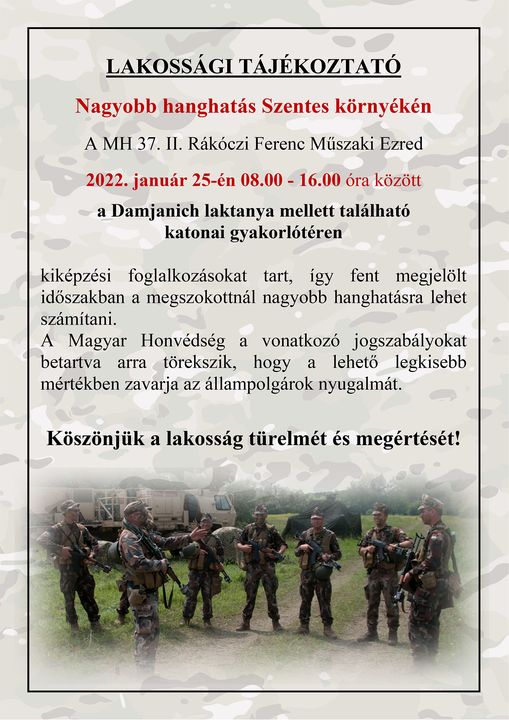 Az MH 37. II. Rákóczi Ferenc Műszaki Ezred nagyobb hanghatással járó kiképzési foglalkozást tart 2022. január 25-én Szentesen, a Damjanich laktanya mellett található katonai gyakorlótéren.