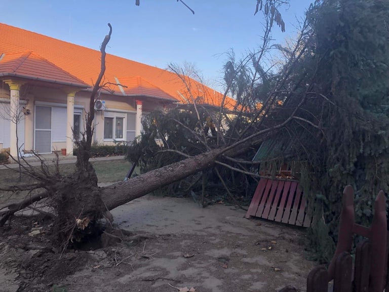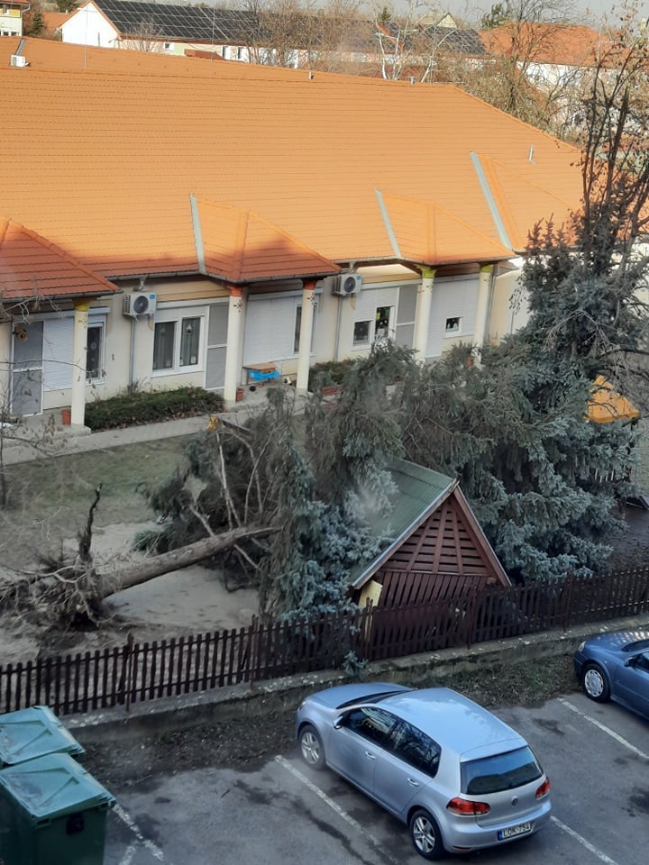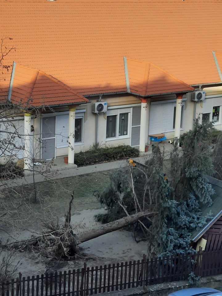 Tegnap délután pl. a Klauzál utcán található óvoda udvarán landolt egy méretes fenyő, szétütve a játéktárolót. Szerencse a szerencsétlenségben, hogy nem az épületre vagy az ott parkoló autókra zuhant.