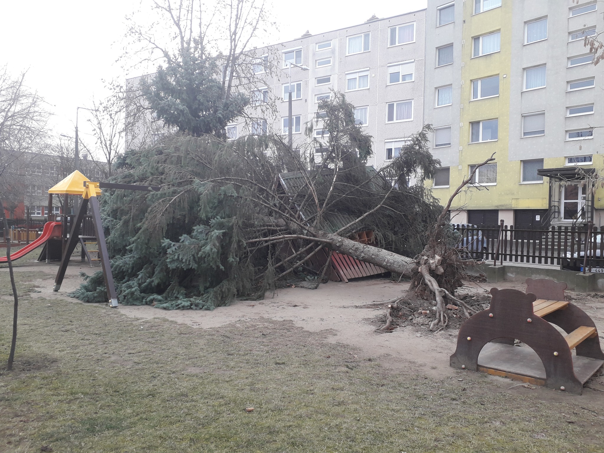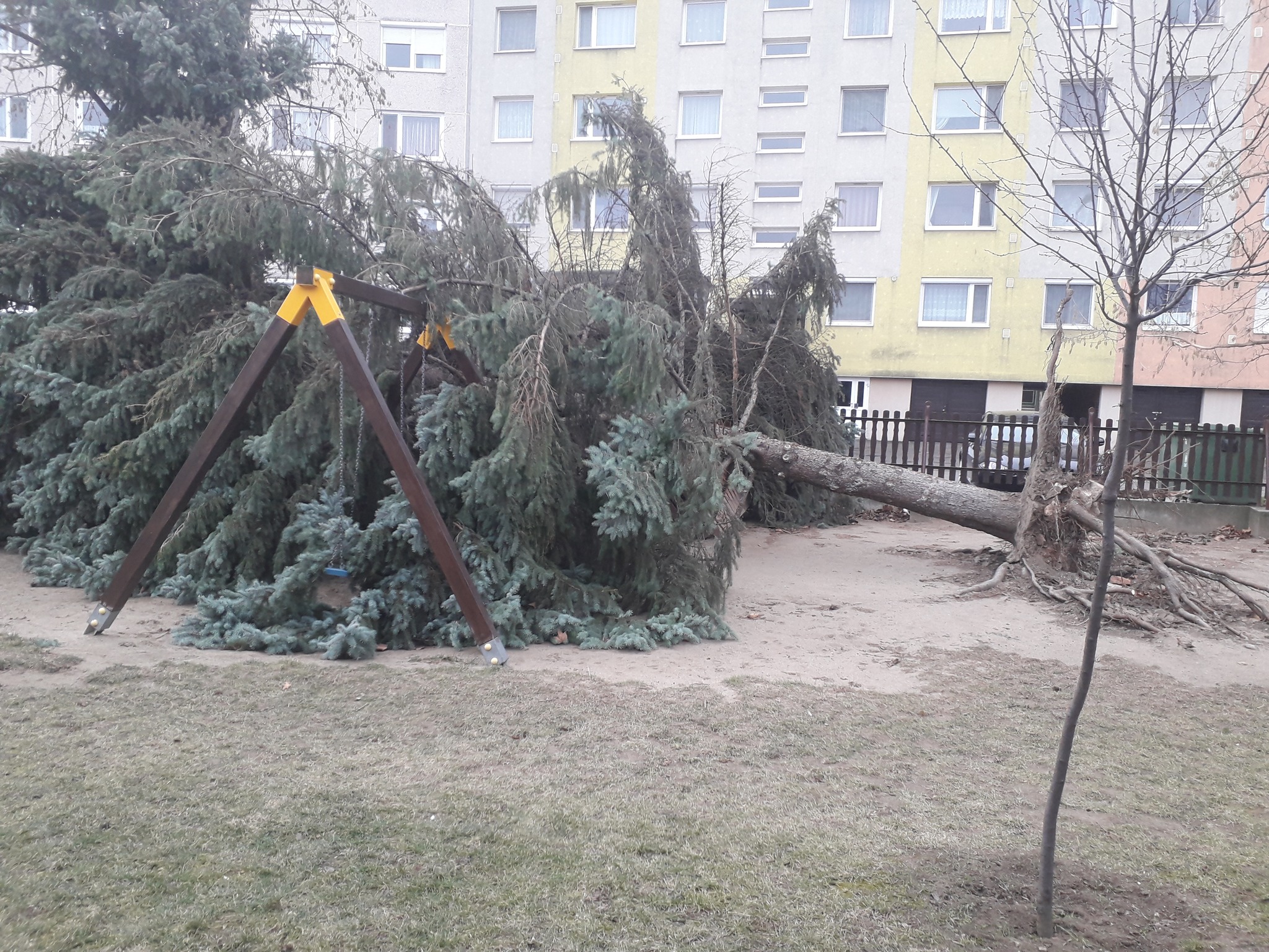 A Klauzál utcai Nyolcszínvirág óvoda udvarán található 8-10 méteres fenyőt tövestől csavarta ki a szél. A hatalmas fa rádőlt a hintára és a játéktárolóra. Szülők ajánlották fel segítségüket, hogy a fenyőt feldarabolják.