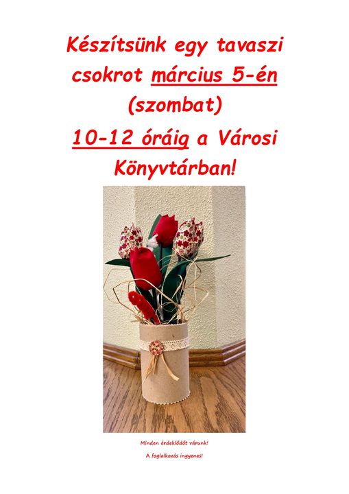 Minden érdeklődőt várunk szeretettel szombaton 10-12-ig a Könyvtárba, egy kis kézműveskedésre! Hozzuk el a tavaszt egy tulipán csokor elkészítésével!