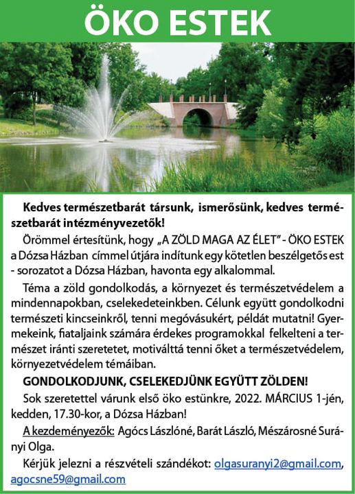 Sok szeretettel várunk első ÖKO ESTÜNKRE, 2022. MÁRCIUS 1-jén, kedden, 17.30-kor, a Dózsa Házban! 🙂