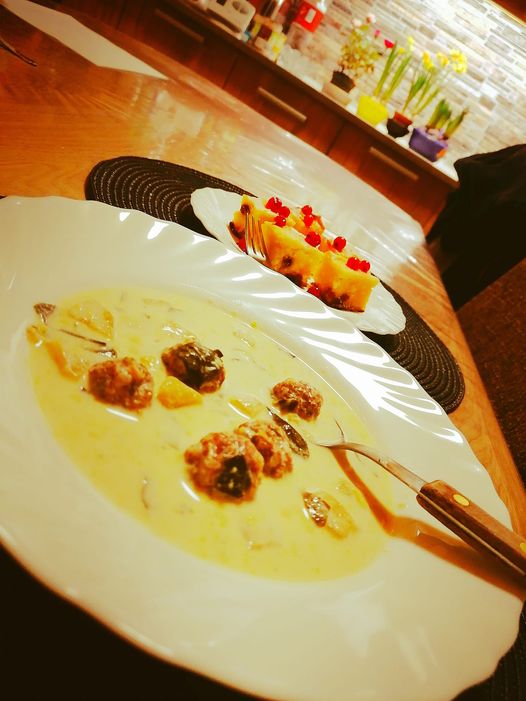 Tejszínes karalábé leves húsgombóccal, borsika fűvel, karalábé levelével, utána édes túrós lepény mazsolával, néhány szem savanykás piros gyümölccsel. Mennyei kombináció! 🤓