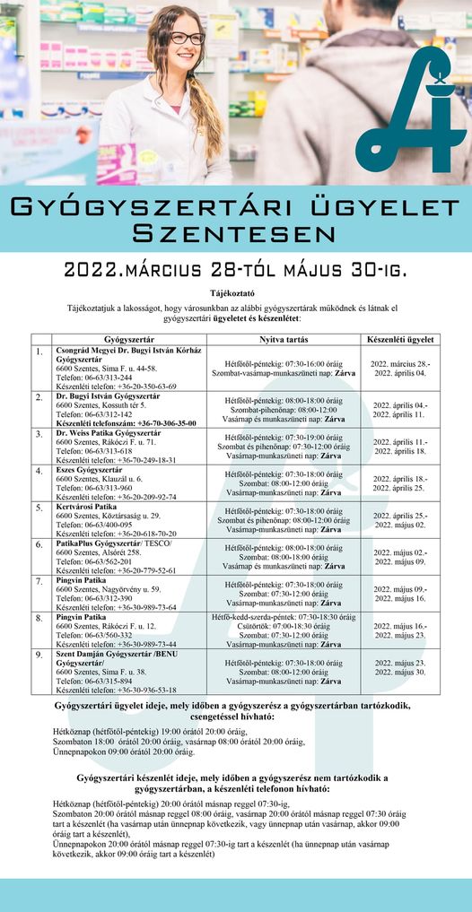 Tájékoztatjuk a lakosságot, hogy városunkban az alábbi gyógyszertárak működnek és látnak el gyógyszertári ügyeletet és készenlétet 2022. március 28 – május 30-ig.