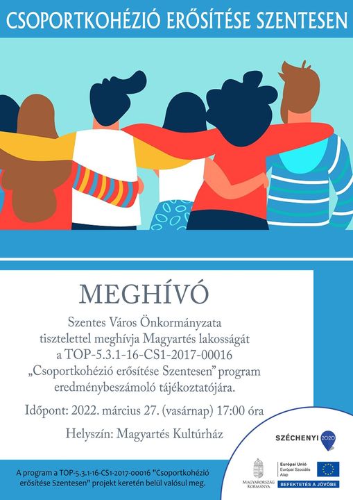 Szentes Város Önkormányzata tisztelettel meghívja Magyartés lakosságát a TOP-5.3.1-16-CS1-2017-00016 „Csoportkohézió erősítése Szentesen” program eredménybeszámoló tájékoztatójára.