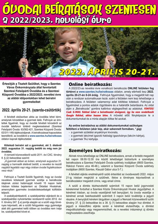 Értesítjük a Tisztelt Szülőket, hogy a Szentes Város Önkormányzata által fenntartott Szentesi Felsőpárti Óvodába és a Szentesi Központi Óvodába a 2022/2023. nevelési évre az alábbi időpontokban lehet beíratni gyermekeiket: 2022. április 20-21. (szerda-csütörtök)