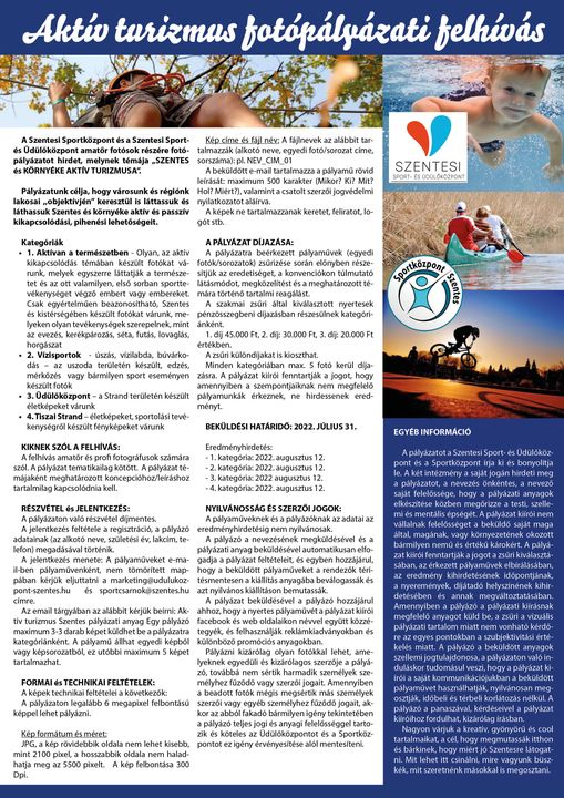 A Szentesi Sportközpont és a Szentesi Sport- és Üdülőközpont amatőr fotósok részére fotópályázatot hirdet, melynek témája „SZENTES és KÖRNYÉKE AKTÍV TURIZMUSA”.