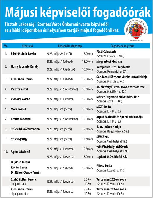 Tisztelt Lakosság! Szentes Város Önkormányzata képviselői az alábbi időpontban és helyszínen tartják fogadóóráikat …