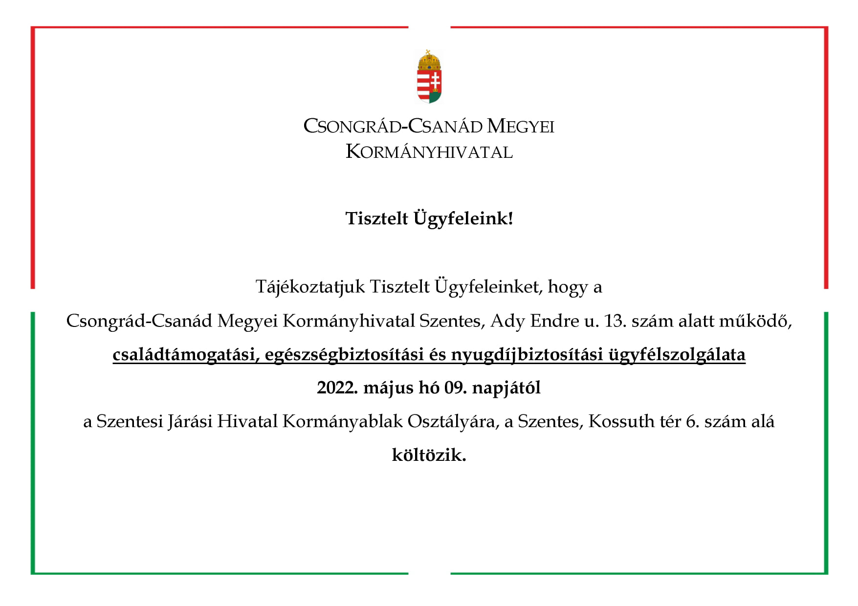 Tájékoztatjuk Tisztelt Ügyfeleinket, hogy a Csongrád-Csanád Megyei Kormányhivatal Szentes, Ady Endre u. 13. szám alatt működő, családtámogatási, egészségbiztosítási és nyugdíjbiztosítási ügyfélszolgálata 2022. május hó 09. napjától a Szentesi Járási Hivatal Kormányablak Osztályára, a Szentes, Kossuth tér 6. szám alá költözik.