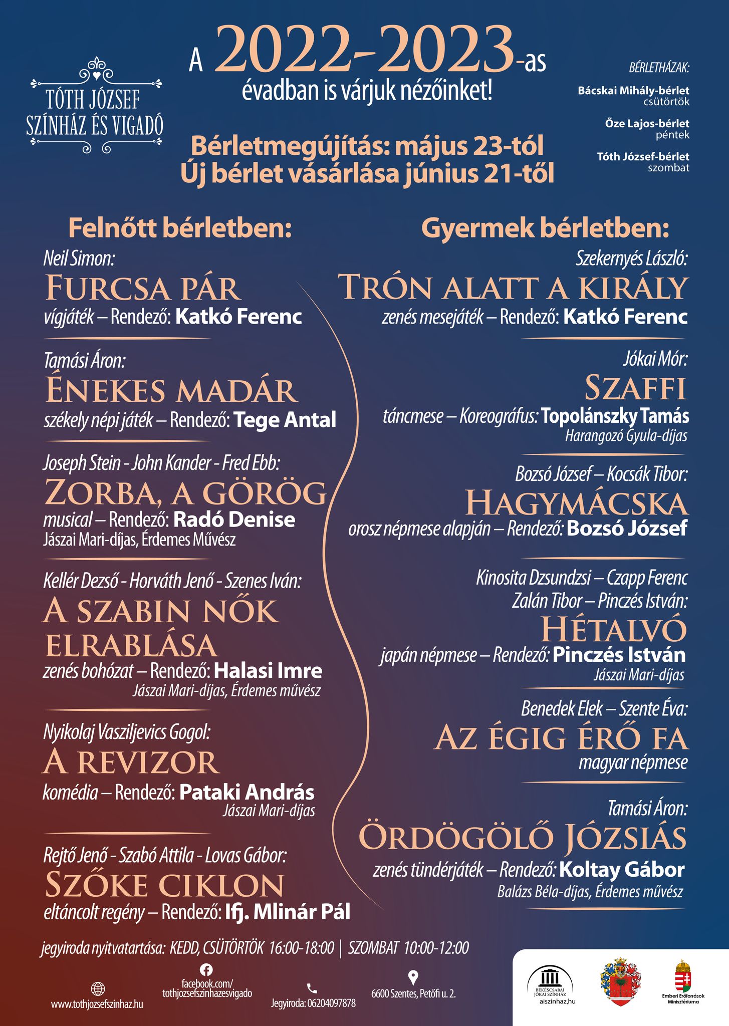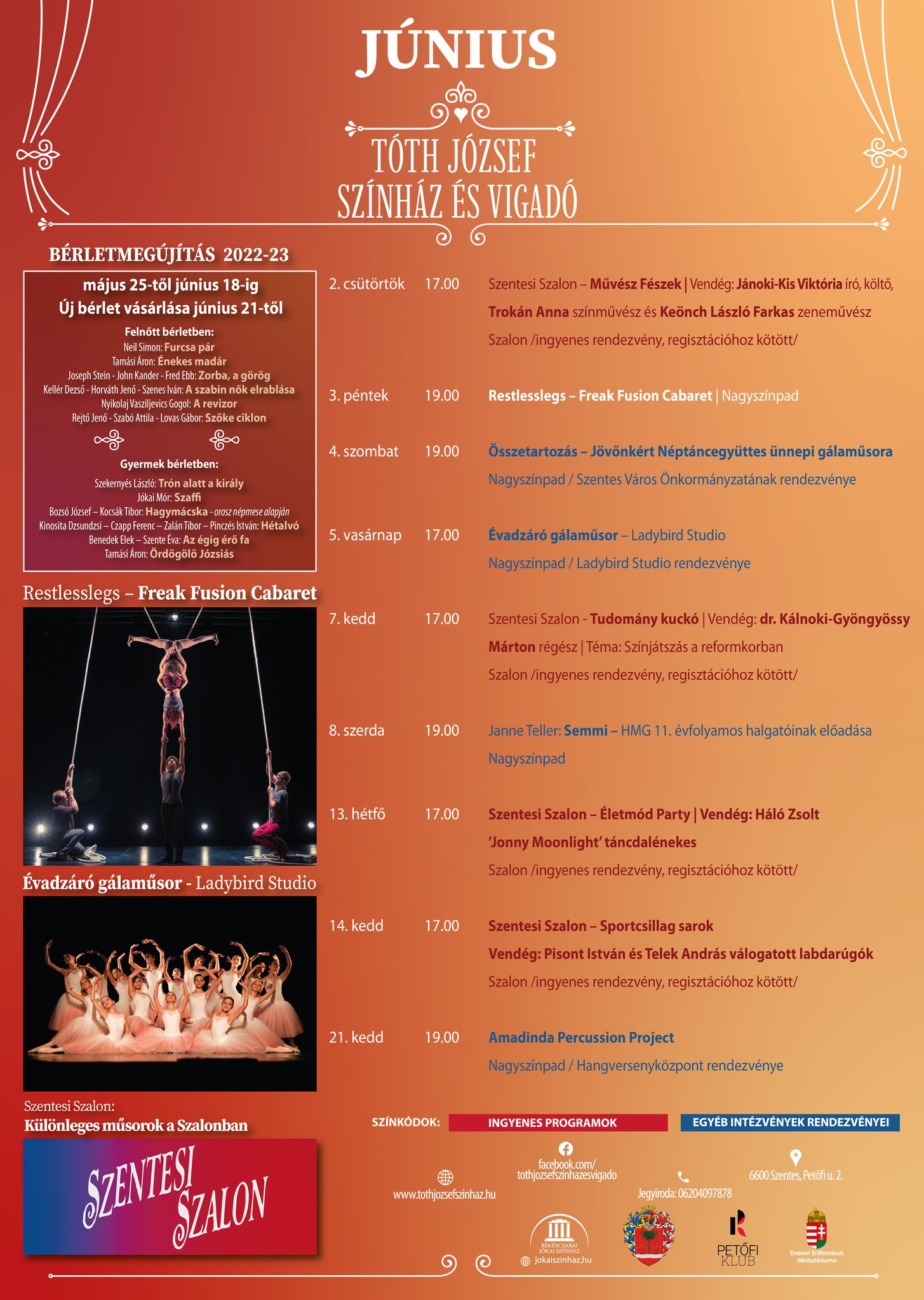 A júniusi programokról, az évad zárásáról, a következő évad előkészítéséről és a bérletek megújításának lehetőségéről is tájékoztatta a sajtó képviselőit a Tóth József Színház és Vigadó vezetősége május 30-án. A sajtótájékoztató vendége Nemcsák Károly Jászai Mari-díjas, érdemes és kiváló művész volt, aki a hétfői Szentesi Szalonban mesélt életéről és pályájáról. A cikket lapunk 7. oldalán találják.