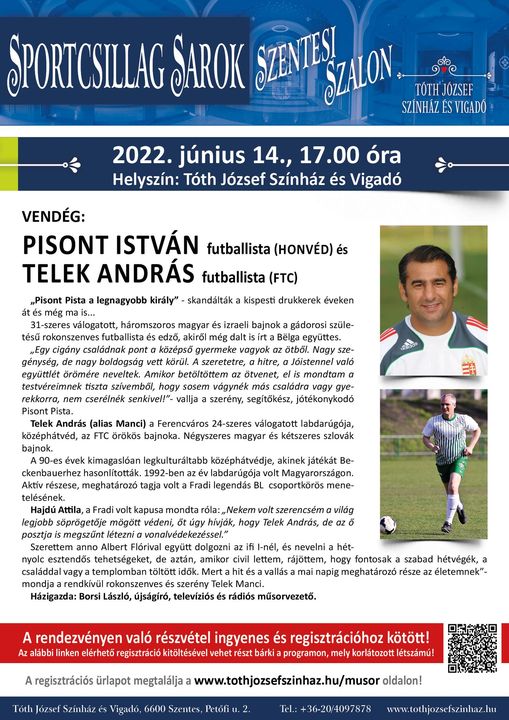 🎭Szentesi Szalon programsorozatunk zárásaként két vendéget is köszönthetünk a Sportcsillag sarok keretein belül. Pisont István és Telek András szeretettel várják a beszélgetni vágyó érdeklődőket 2022. június 14-én 17.00-kor a Tóth József Színház és Vigadóban.