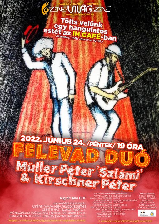 https://www.jegy.hu/program/felevad-duo-136408 #HangversenyközpontSzentes #ZeneVilágZene #ÉletÉrtékÉlmény #MüllerPéterSziámi #KirschnerPéter #FelevadDuo #IHCafé #Szentes