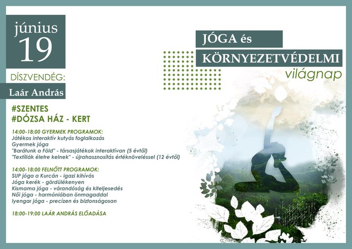 Immár második alkalommal szervezi meg Szenczy Erzsébet jógaoktató a Jóga és környezetvédelmi világnapot Szentesen, amelynek helyszíne ismét csodálatos környezetben, a Dózsa-kertben lesz. Idén Simon Alma szervezőtársával készülnek június 19-re, vasárnapra. A tudatosság, a stabilitás,a környezetvédelem és a fenntarthatóság jegyében tölthetnek el egy kellemes, informatív napot a résztvevők.