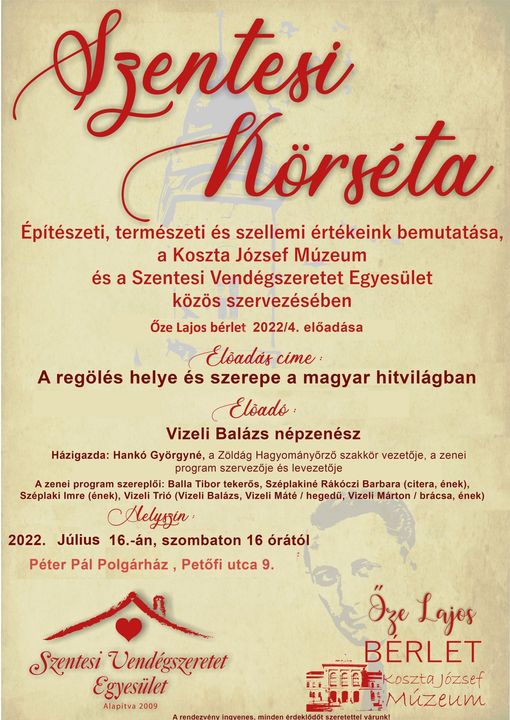 Július 16-án, szombaton 16 és 18 óra között vehetnek részt a következő Szentesi körsétán, az Őze Lajos bérlet 4. előadásán, melynek címe: A regölés helye és szerepe a magyar hitvilágban. Az előadó Vizeli Balázs népzenész.