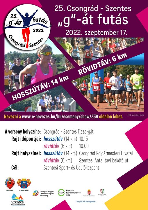 Elindult a nevezés a két várost összekötő sporteseményre. A szeptember 17-i 25. Csongrád- Szentes „g-ÁT” futáson két távon tehetik próbára magukat a futók: a hosszú táv 14, a rövid táv pedig 6 kilométer lesz. A sportolók a hosszú távra a csongrádi Polgármesteri Hivatal elől, a rövid távra az Antal tavi bekötő útról startolnak majd, a befutó pedig a Szentesi Üdülőközpontban lesz.