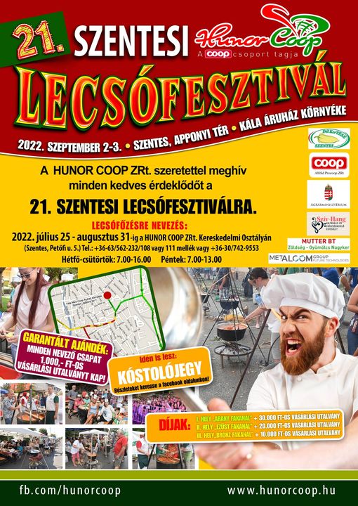 Lecsófőzésre nevezés 2022. július 25 – augusztus 31-ig a HUNOR COOP ZRt. Kereskedelmi Osztályán lehet (Szentes, Petőfi u. 5.) Tel.: +36-63/562-232/108 vagy 111 mellék vagy +36-30/742-9553 Hétfő-csütörtök: 7.00-16.00 péntek: 7.00-13.00