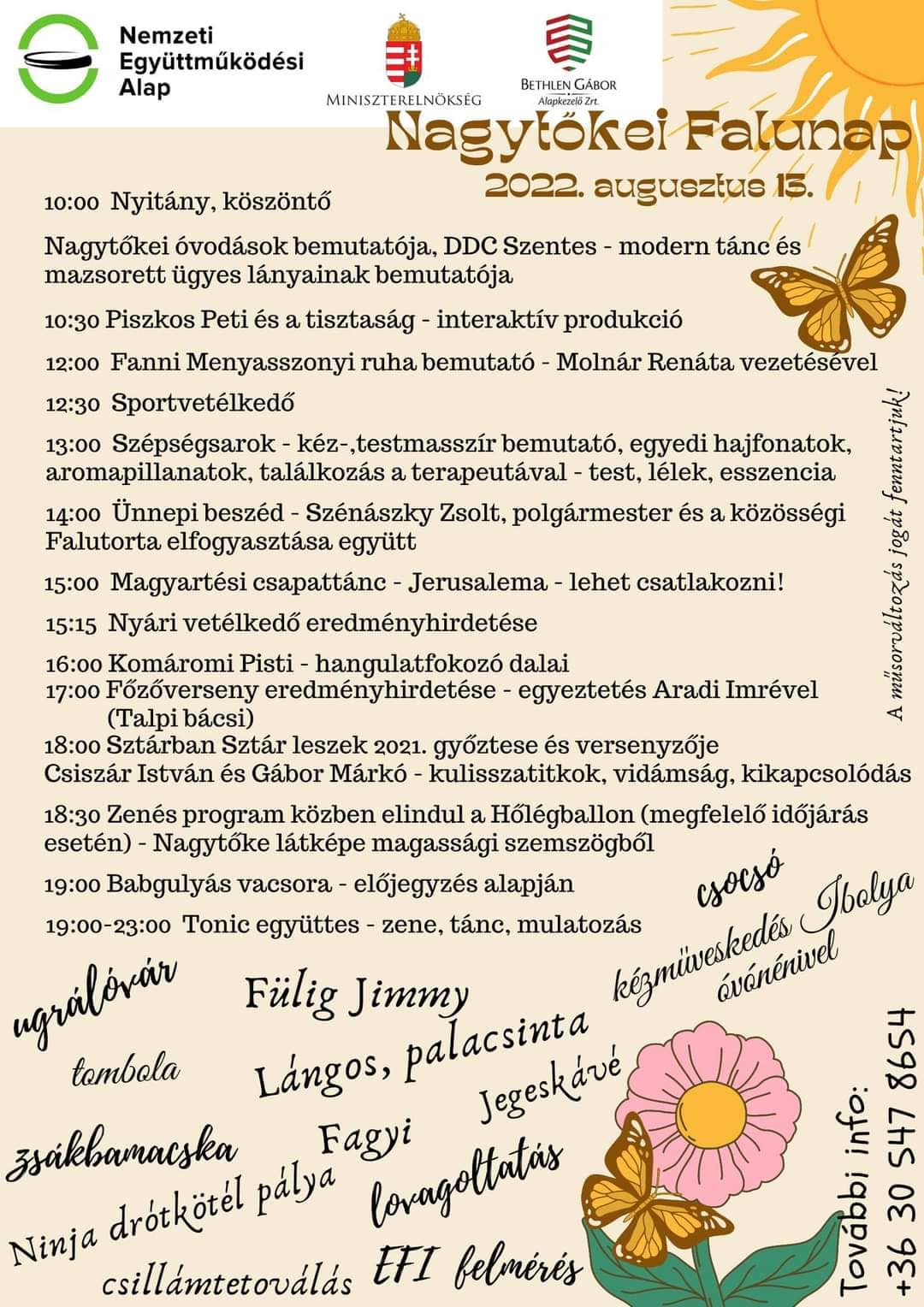 2022. augusztus 13-án tartja Nagytőke a falunapját. Sok-sok programmal várják a vendégeket és a lakosokat. Az összefoglaló plakát mellett külön plakátok készültek egy programról. Jó böngészést és jó szórakozást kívánunk hozzá!