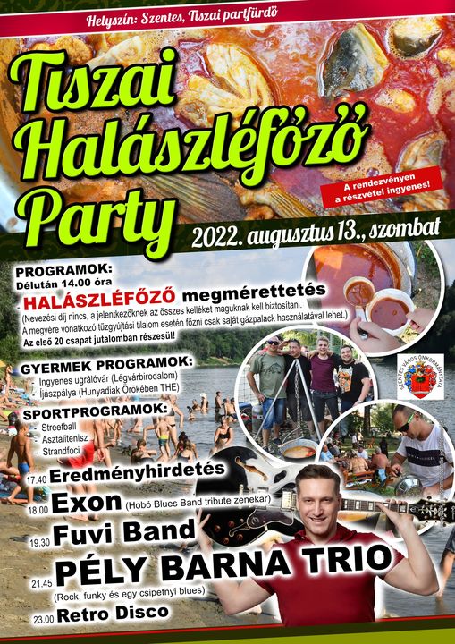 Hetedik alkalommal gyűlnek össze a szentesi tiszai strandon a halászléfőzés helyi mesterei, hogy számot adjanak tudásukról. Az előző évekhez hasonlóan, idén is arra biztatunk mindenkit, hogy látogasson ki a Tisza partra, ahol finom falatok, jó zene, hűtött italok és igazán jó hangulat vár mindenkit. Fellép az Exon zenekar, a Fuvi Band, az este sztárfellépője pedig a Pély Barna Trio. 23 órától Retro disco zárja a partit.