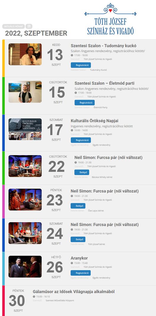 Ezeket a rendezvényeket ingyenesen tekinthetjük meg, de regisztrációhoz kötött! Regisztrálni a www.tothjozsefszinhaz.hu/musor oldalon lehet, ha a megfelelő hónapot és eseményt kiválasztja.