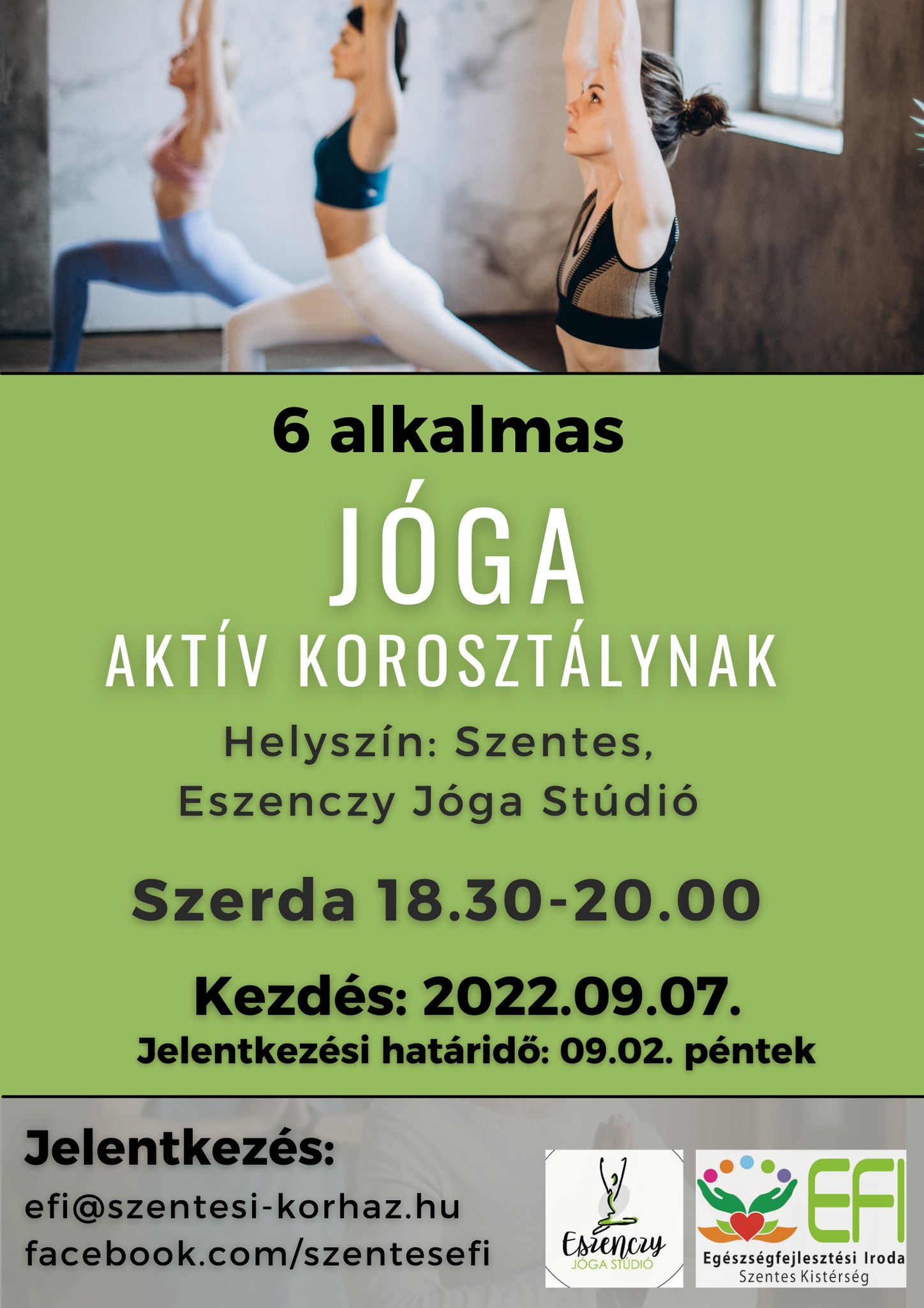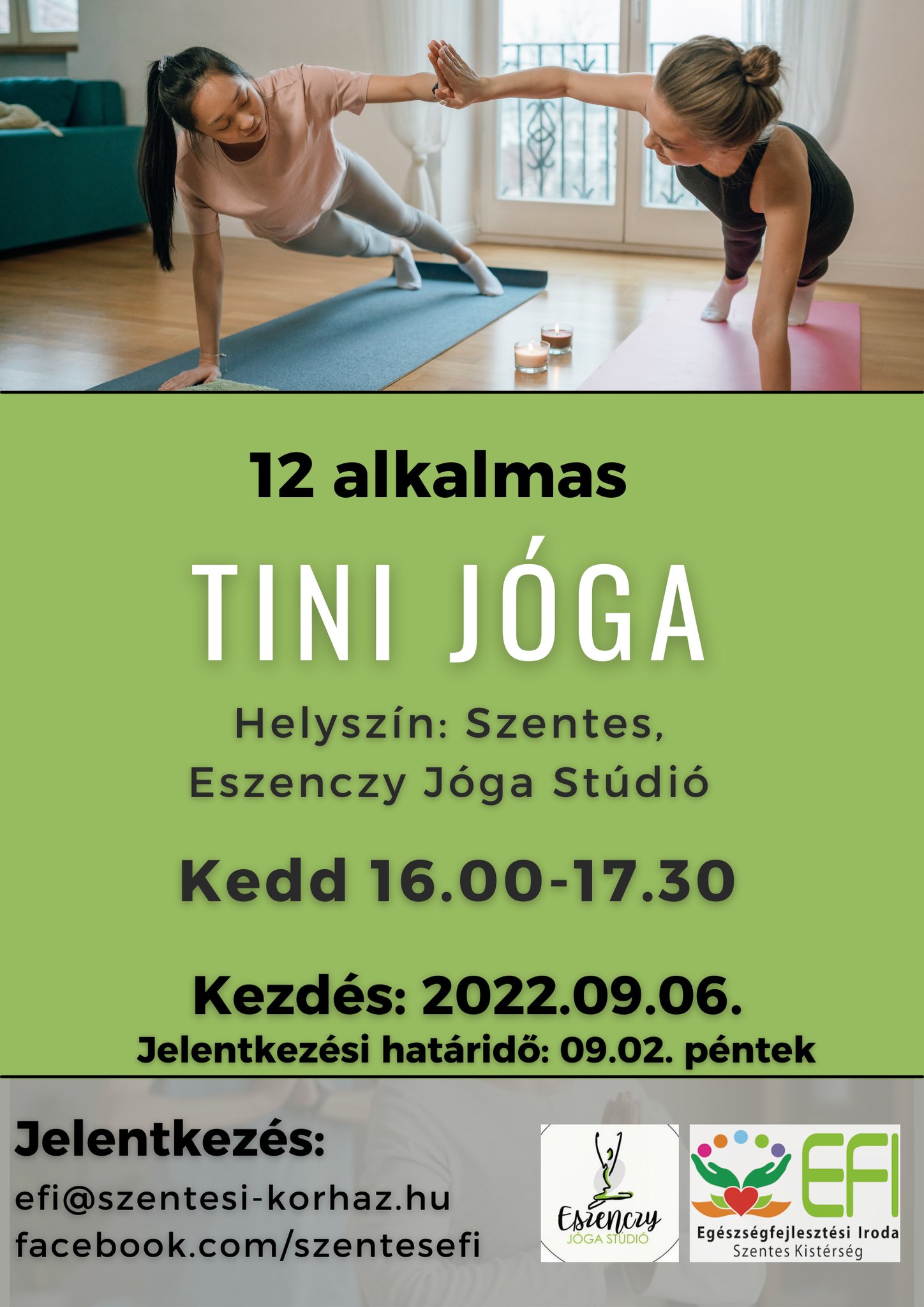 Szeptember elején újraindulnak a jógafoglalkozások az aktív korosztály és a tinik számára. Az óráknak ismét az Eszenczy Jóga stúdió ad helyet, melyet Szenczy Erzsébet jógaoktató tart hetente egyszer másfél órában. A részleteket a Szentesi Élet 7. oldalán olvashatják.