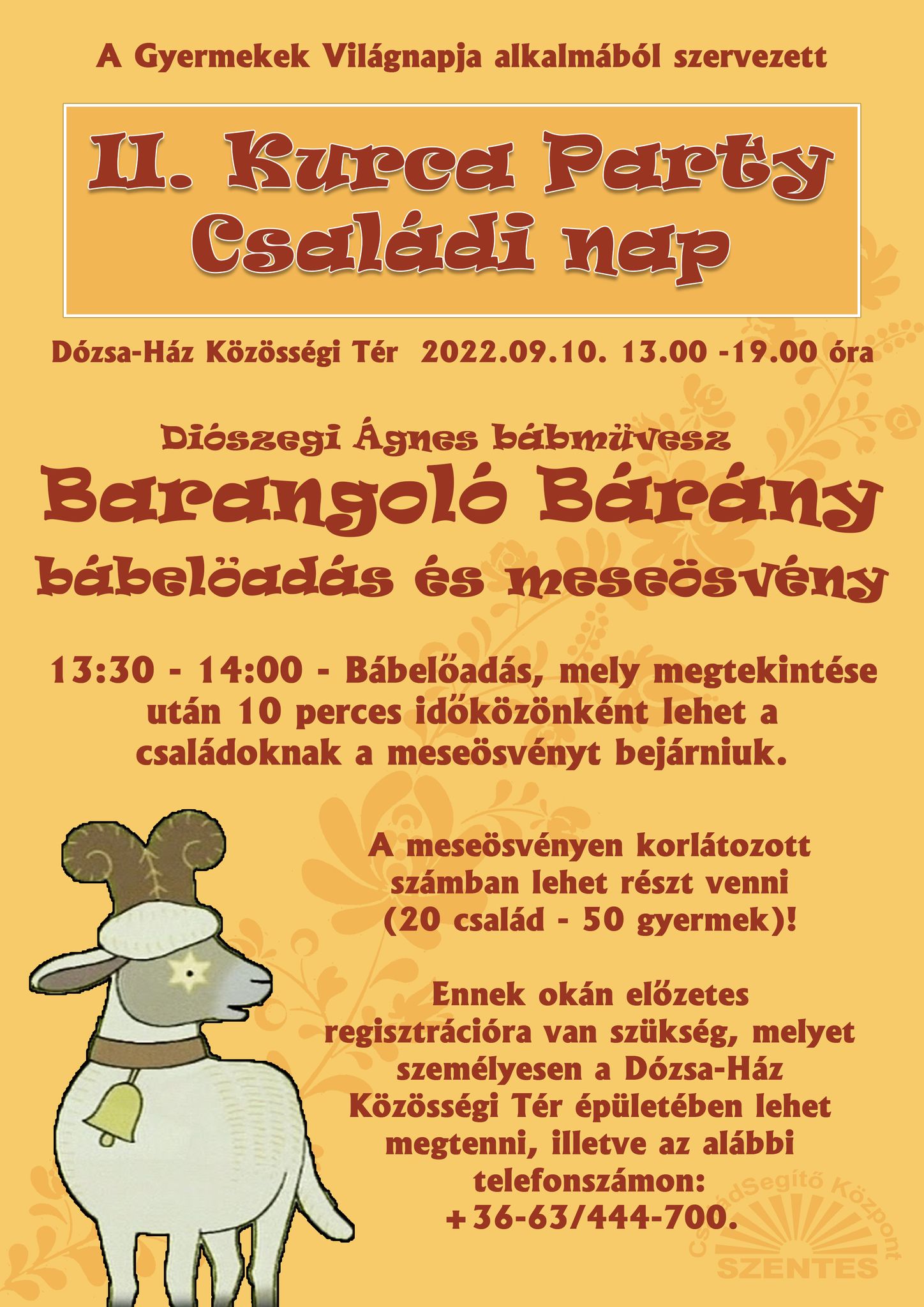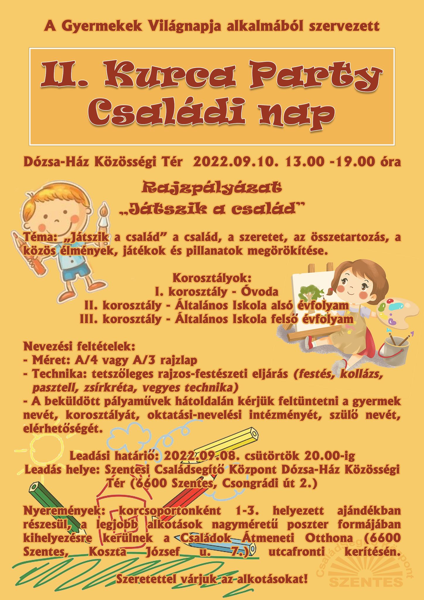 A Szentesi Családsegítő központ 2022. szeptember 10-én rendezi meg a Gyermekek Világnapja alkalmából a Kurca Party Családi napot a Dózsa-háznál. A programokról az alábbi plakátokról tájékozódhat!