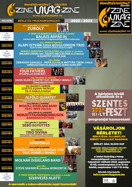 Az elmúlt több mint egy évtizedben úgy Szentes, mint a régió és az ország meghatározó közművelődési pódiumává vált a szentesi Hangversenyközpont. Íme az idei évad összefoglaló plakátja. Vásároljon rendkívül kedvezményes bérletet, amellyel egyben állandó és fix széket foglalhat magának!
