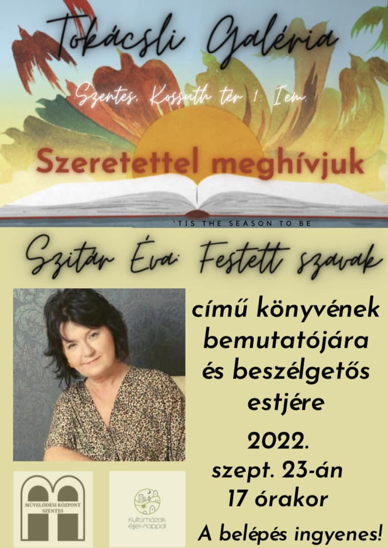 Sok szeretettel meghívjuk Önöket a Tokácsli Galériába 2022. szeptember 23-án 17 órára Szitár Éva Festett szavak című könyvének bemutatójára!