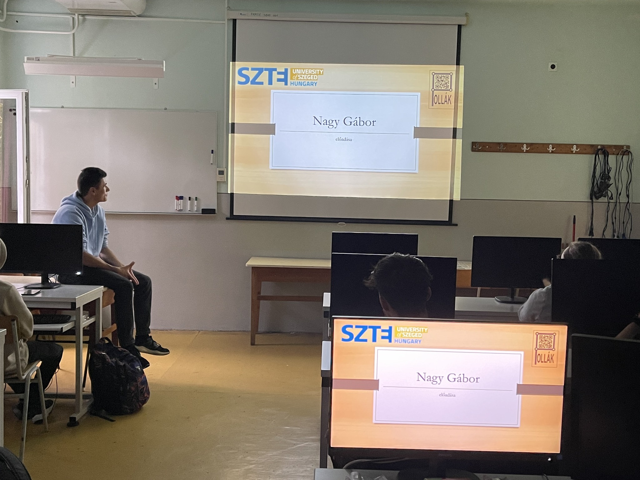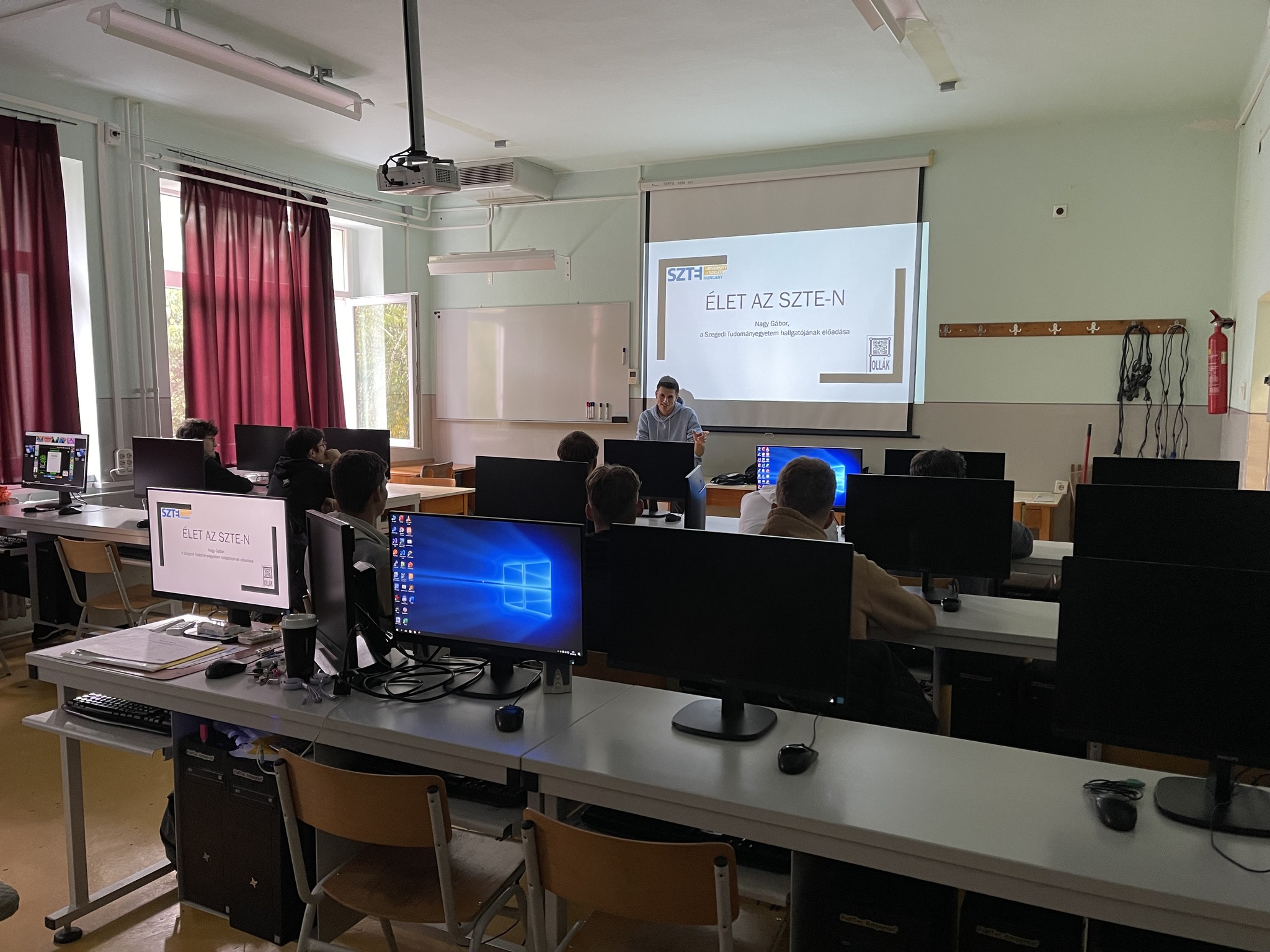 Nagy Gábor kitűnő eredménnyel végzett néhány hónappal ezelőtt iskolánkban, jelenleg pedig a Szegedi Tudományegyetem Természettudományi és Informatikai Karának elsőéves hallgatója. Egykori oktatói és diáktársai invitálására most visszatért hozzánk, hogy a 12. és 11. évfolyamos szakmai órákon meséljen felsőoktatási élményeiről, és megerősítse az érettségi előtt állókban a műszaki pálya iránti elkötelezettséget.