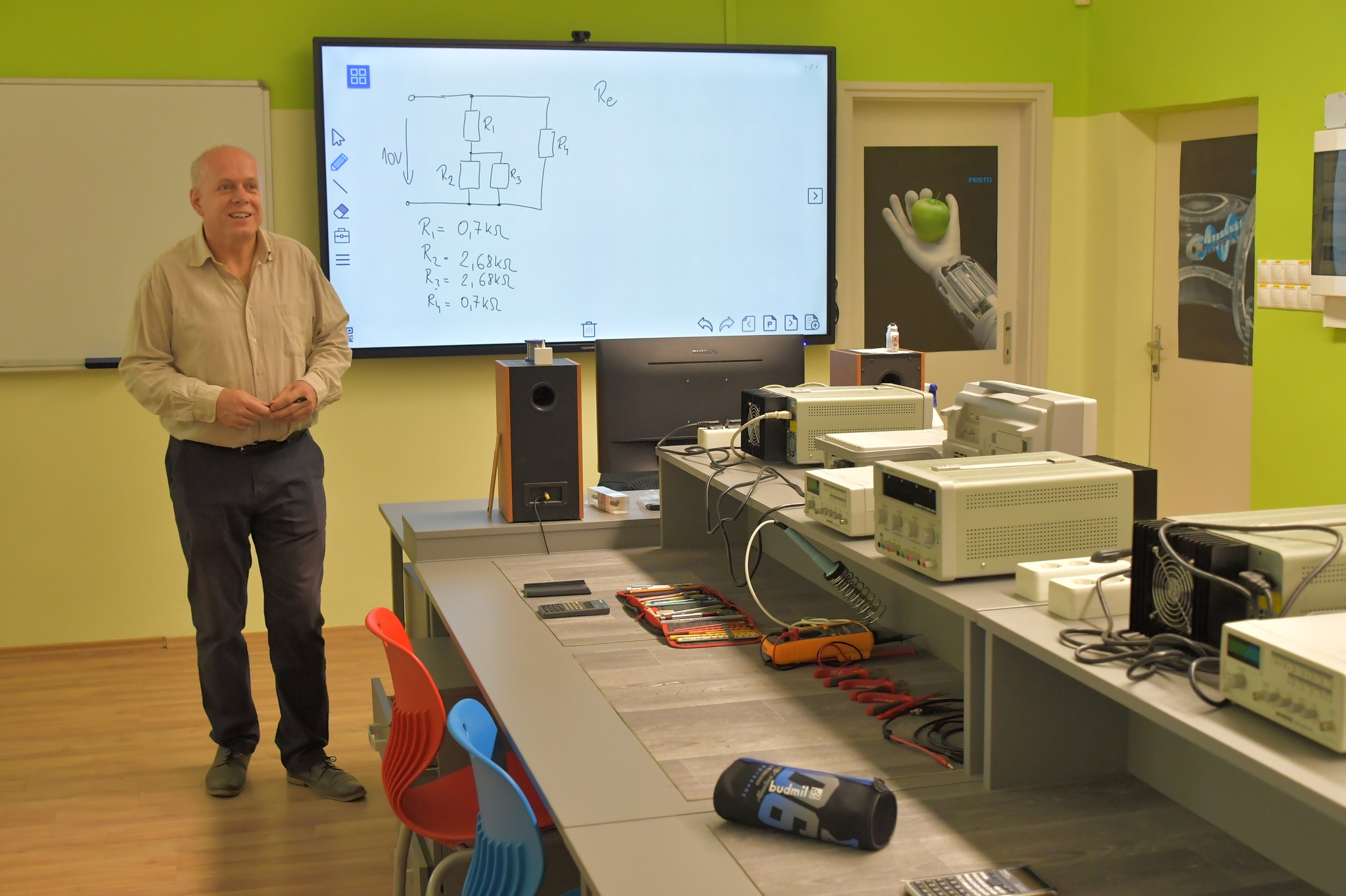 Ágoston Csaba, a tanterem gazdája büszkén mutatta be az okostábla által vezérelt mérőeszközöket és számítógépeket a 11. évfolyamos ipari informatikusok közreműködésével.