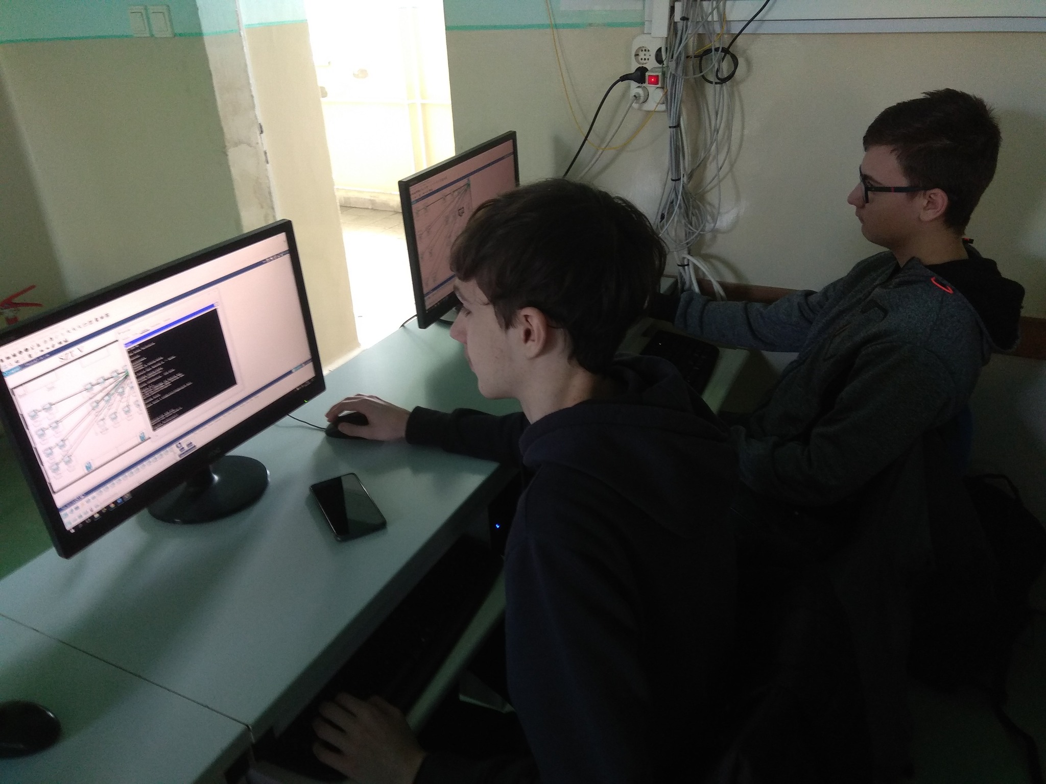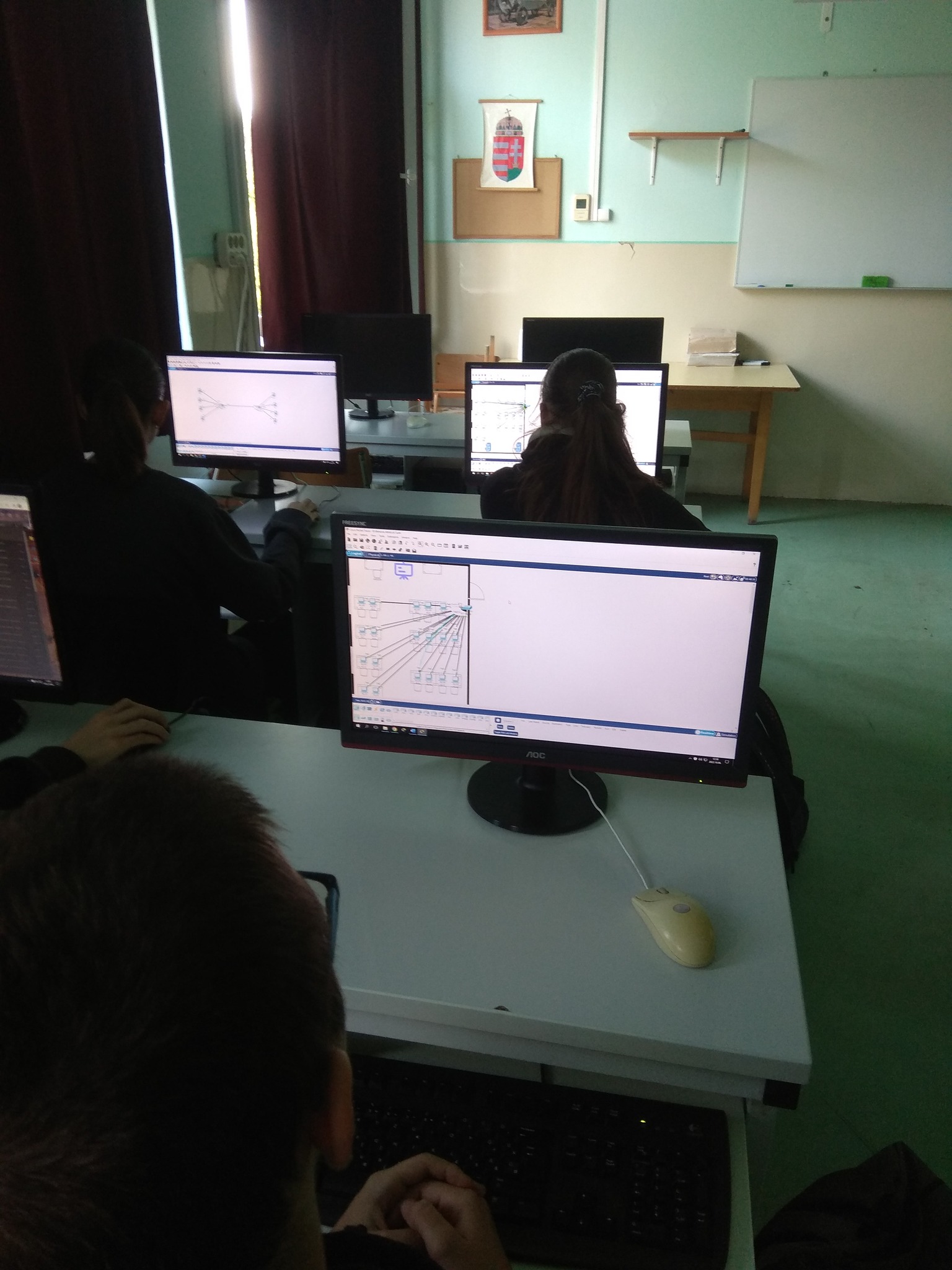 A 10. évfolyamosok gyakorlatban alkalmazták az IKT projektmunka tantárgy keretén belül tanultakat, megtervezték a Számtech. V. terem hálózatát. Bár szakértőként ők így fogalmaztak volna: az app.diagrams.net oldalon elkészítették a terem alaprajzát, majd Packet Tracer hálózat szimulációs programban a topológiát, és a hálózati eszközökön alapkonfigurációt hajtottak végre. 🤓