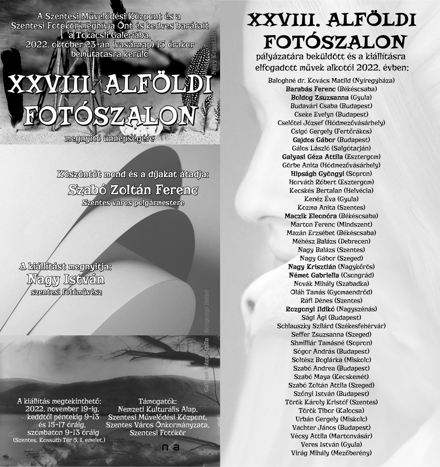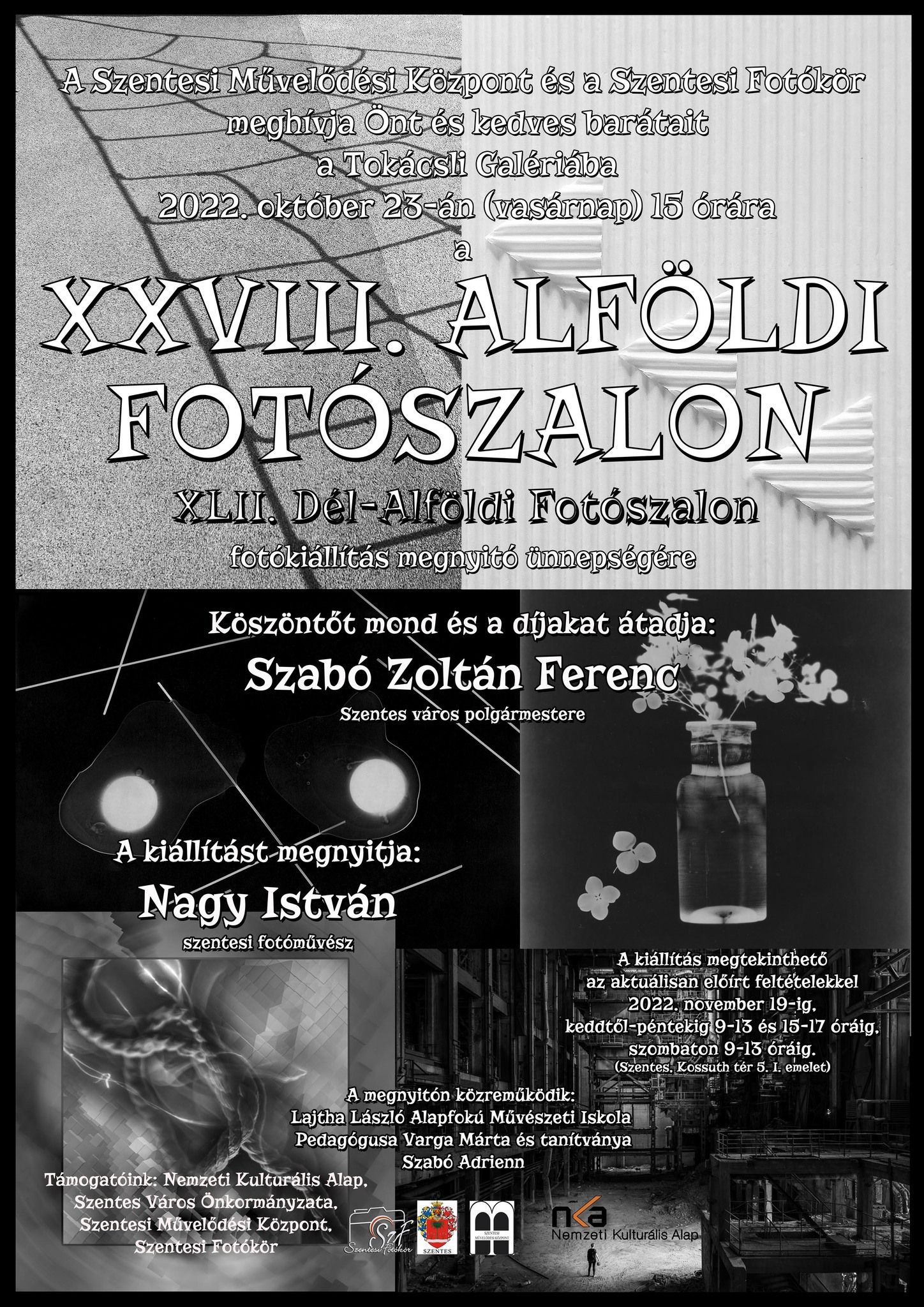 A Szentesi Művelődési Központ és a Szentesi Fotókör meghívja Önt és kedves barátait a Tokácsli Galériába, 2022. október 23-án (vasárnap) 15 órakor bemutatásra kerülő (XLII. Dél-Alföldi Fotószalon) megnyitó ünnepségére.