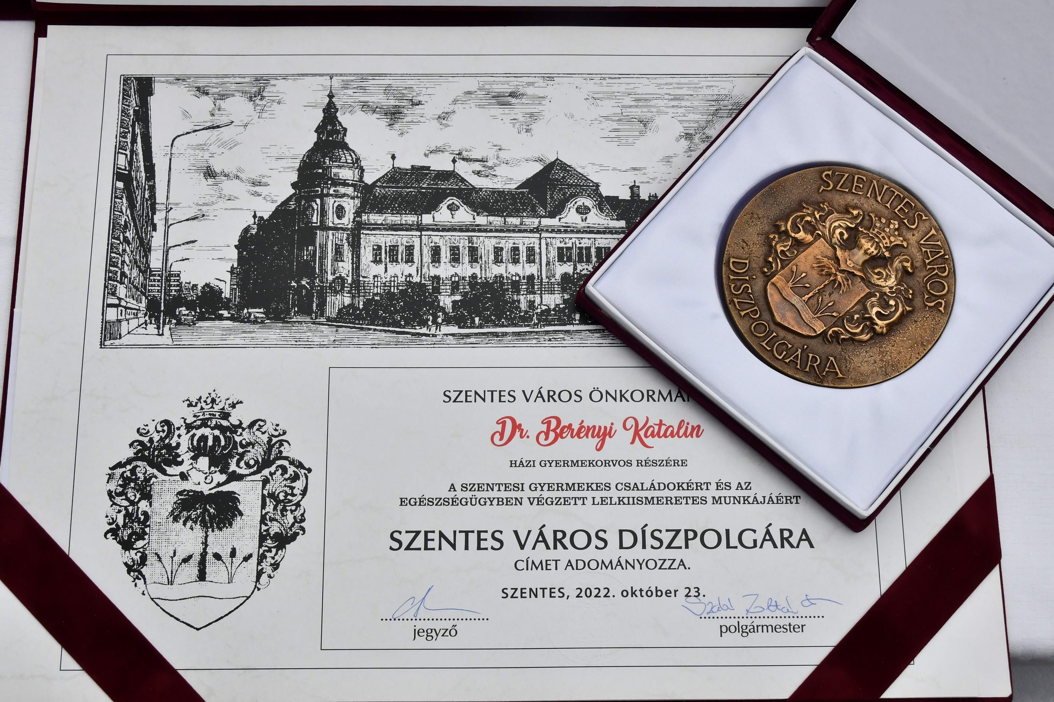 Szentes Város Önkormányzata Képviselő-testülete Dr. Berényi Katalin részére SZENTES VÁROS DÍSZPOLGÁRA címet adományozott a gyermekek és családok egészsége érdekében kifejtett lelkiismeretes munkájáért.