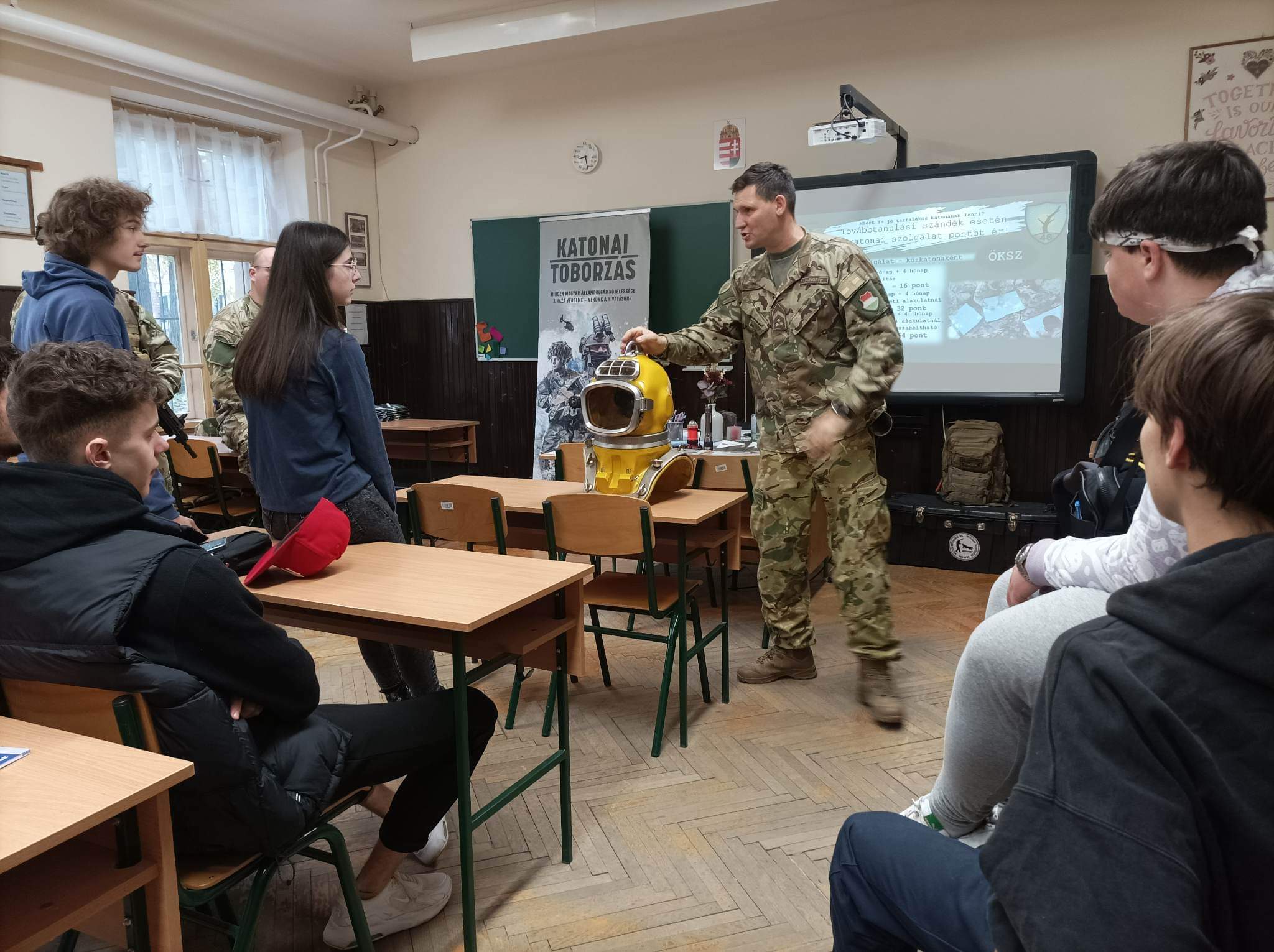 A katonai pálya lehetőségeit, a műszaki ezred feladatrendszerét, technikai eszközeit, valamint a katonák mindennapi életét. ismerhették meg a szentesi Horváth Mihály Gimnázium tanulói az iskolában megrendezett pályaorientációs napon.