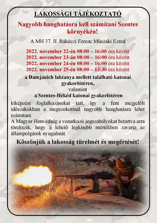 valamint a Szentes-Hékéd katonai gyakorlótéren kiképzési foglalkozásokat tart, így a fent megjelölt időszakokban a megszokottnál nagyobb hanghatásra lehet számítani.