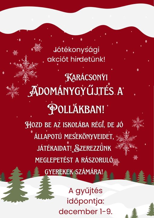 Ma advent első vasárnapja van! 🕯️🌲🌟 Az ünnep közeledtével gondolunk azokra is, akik nehéz körülmények között várják a karácsonyt, így adománygyűjtést hirdetünk a Családsegítő Központ által gondozott rászorulók számára. Kérjük iskolánk diákjait és dolgozóit, hogy december 1. és december 9. között csatlakozzanak az akcióhoz! Hálásan köszönjük a mellékelt felhívás megosztását is! 💝