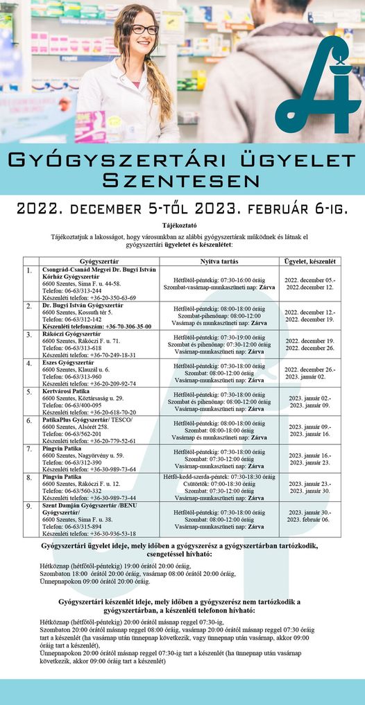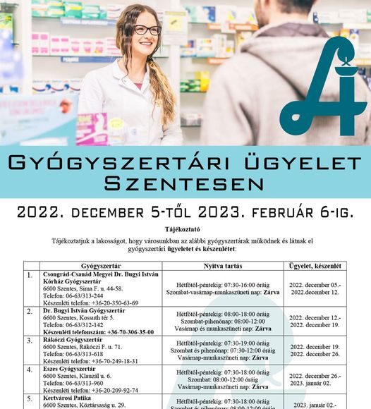 Tájékoztatjuk a lakosságot, hogy városunkban az alábbi gyógyszertárak működnek és látnak el gyógyszertári ügyeletet és készenlétet 2022. december 5-től 2023. február 6-ig.