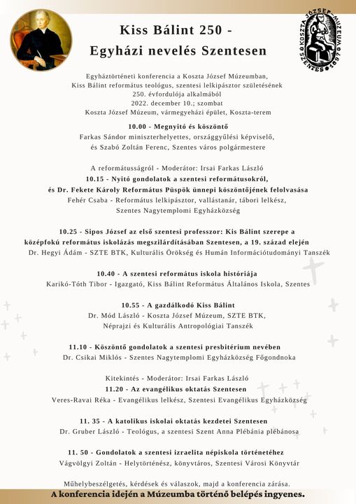 Kamarakonferenciát rendez a Koszta József Múzeum Kiss Bálint református teológus, lelkipásztor születésének 250. évfordulója alkalmából december 10-én. A program részletes ismertetőjét a plakáton olvashatja.